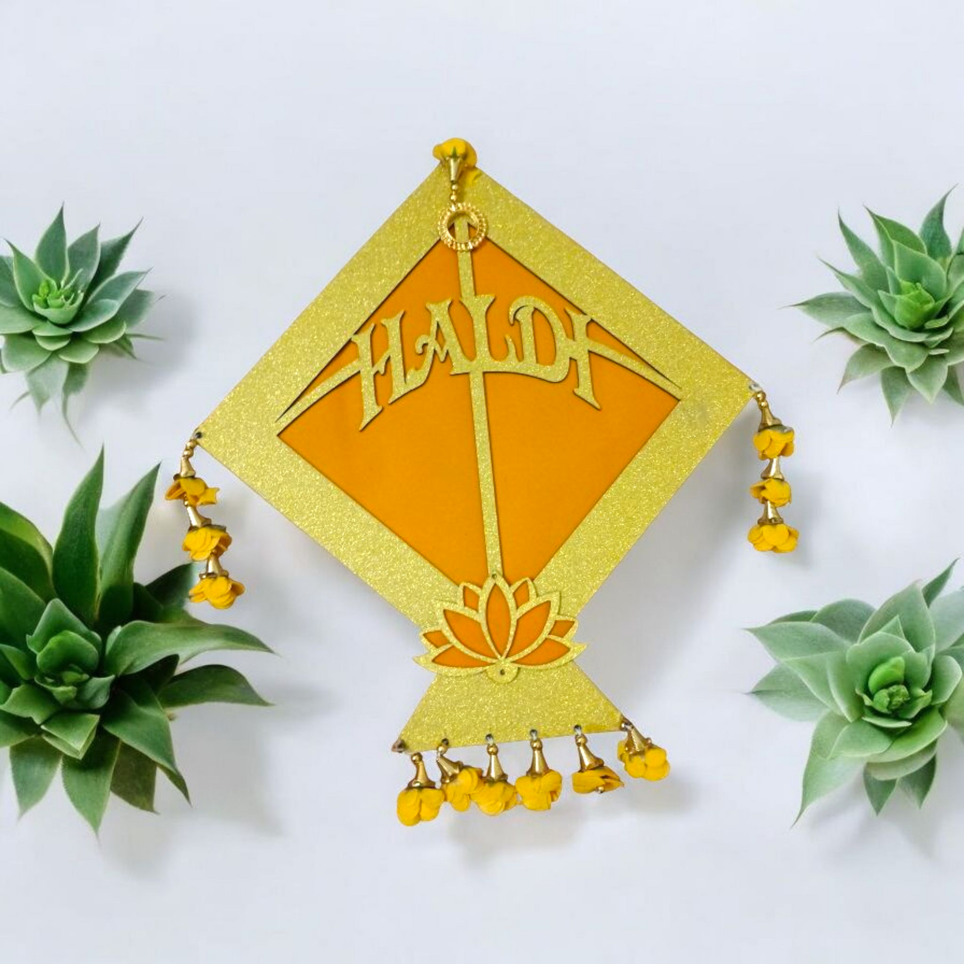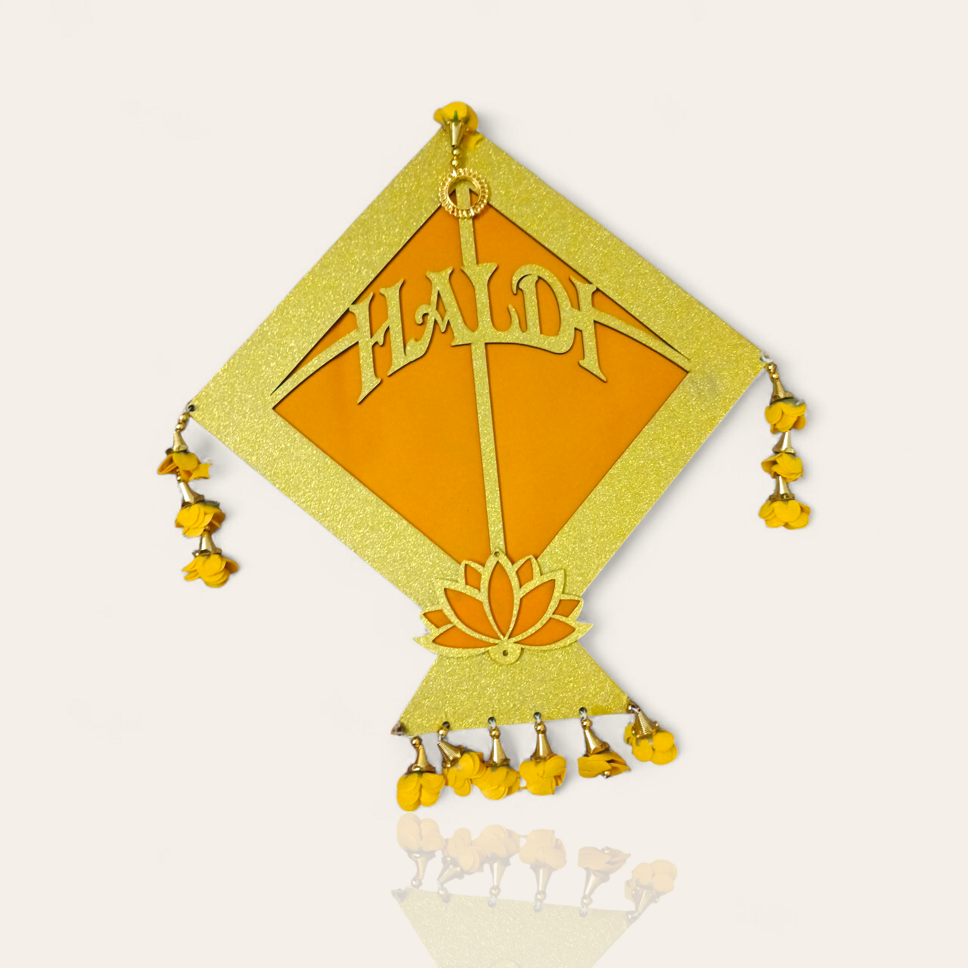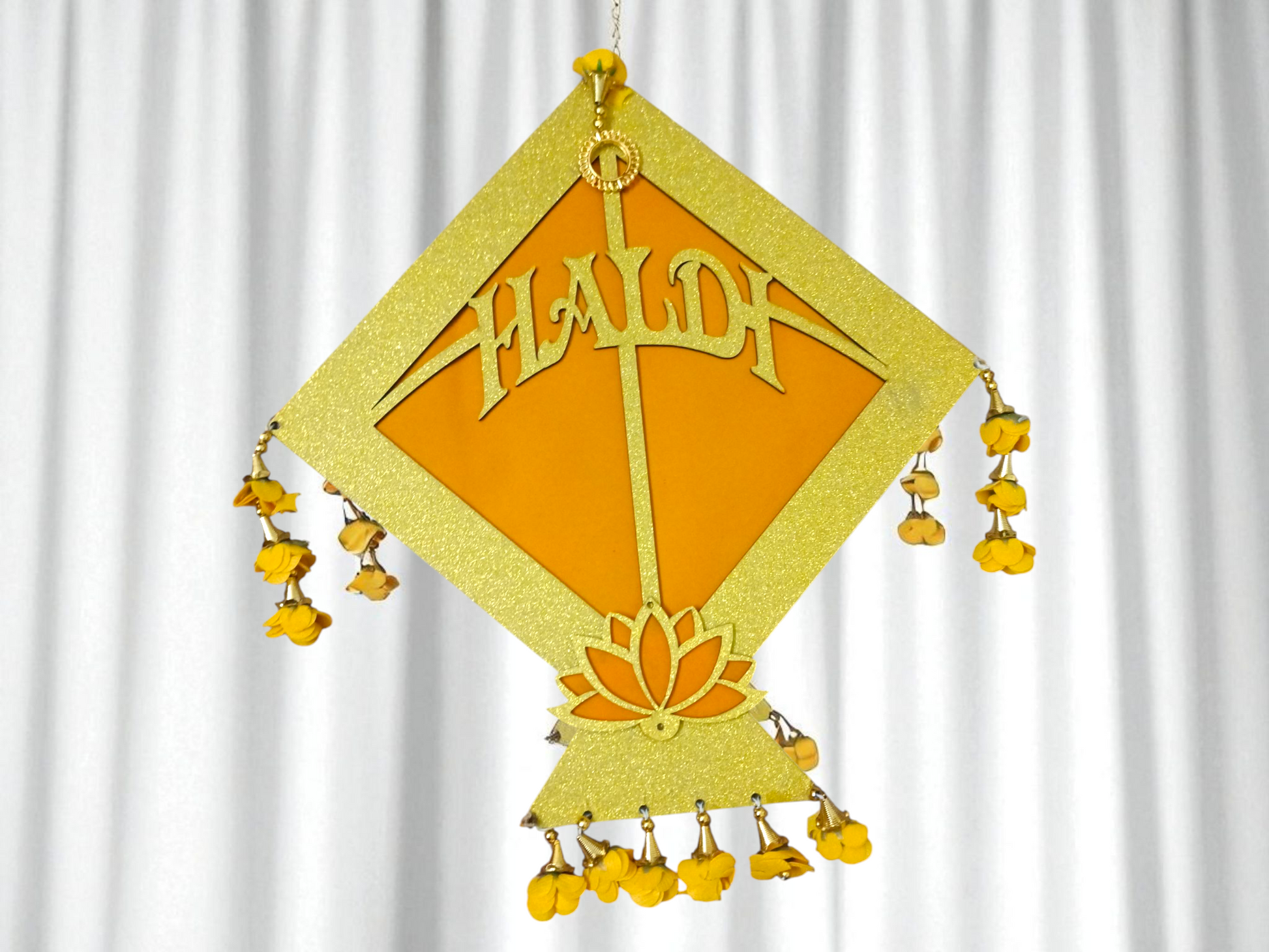 Add a touch of tradition and elegance to your Haldi ceremony with our handcrafted Haldi Decorative Kite. Designed in a vibrant mustard yellow and golden glitter combination, this kite-shaped hanging decor piece brings festive charm and cultural richness to your wedding celebration.