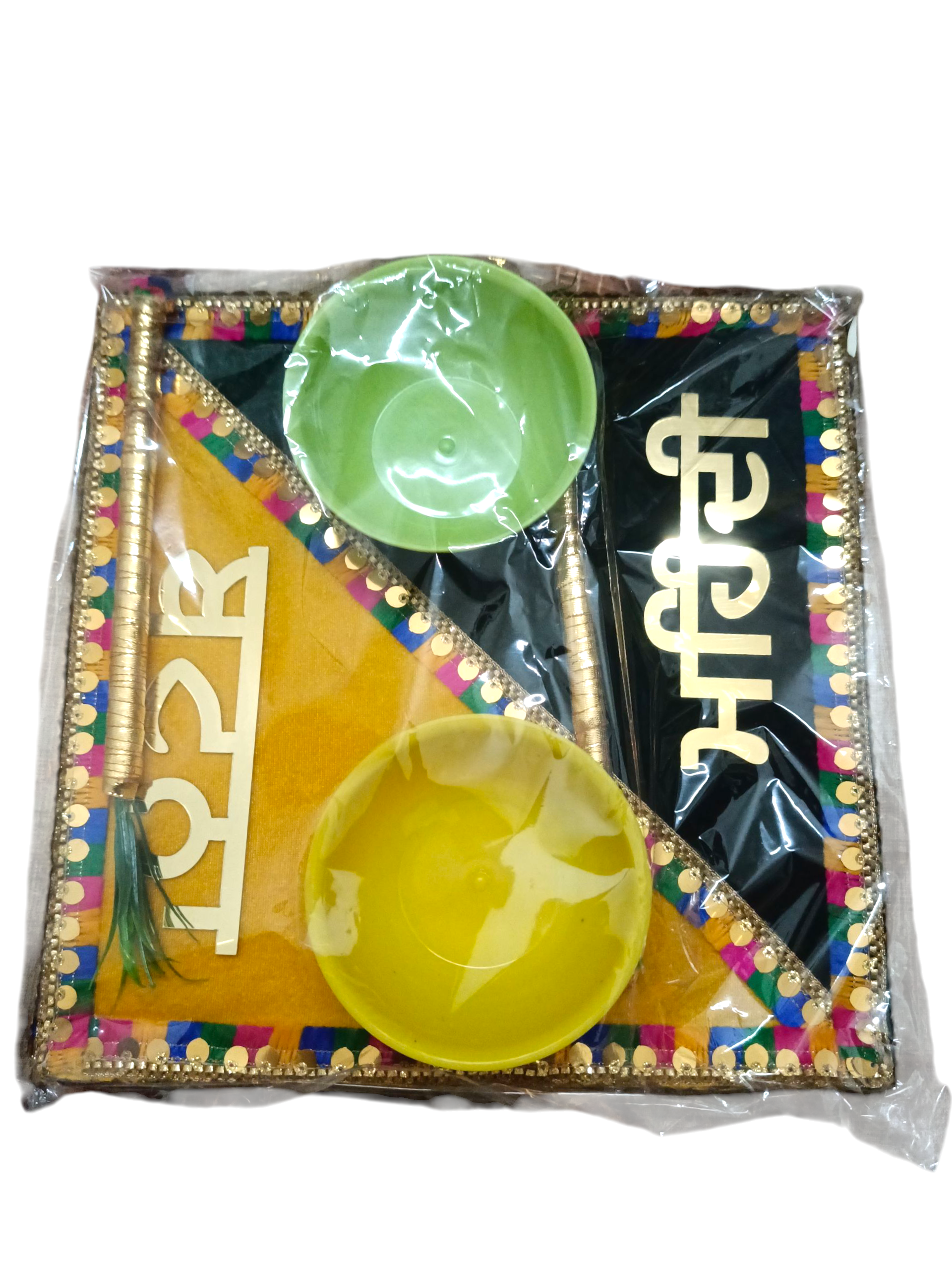 Dual-section tray with labeled “HALDI” and “MEHANDI” compartments