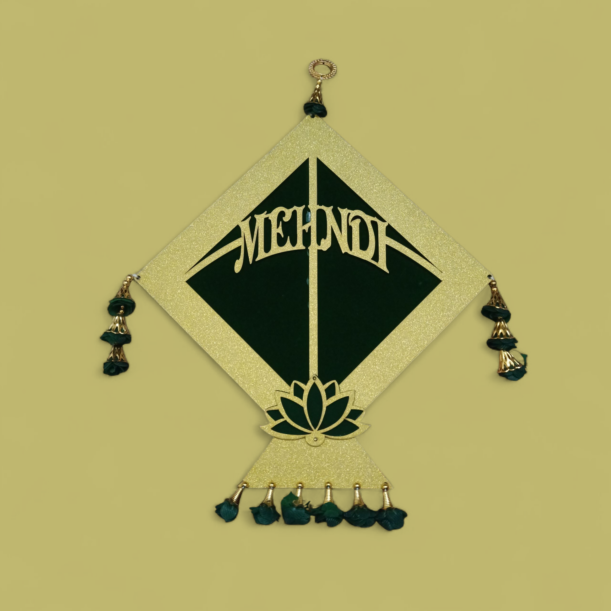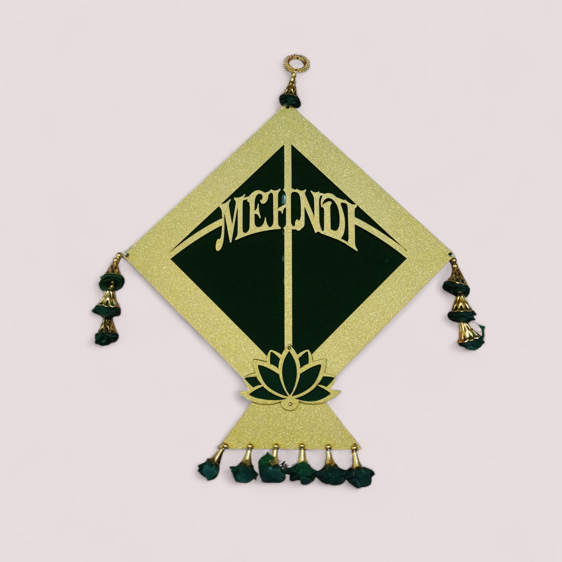 Elegant Design: Diamond-shaped kite with "MEHNDI" beautifully cut out, enhanced with glittery golden borders and a lotus motif.