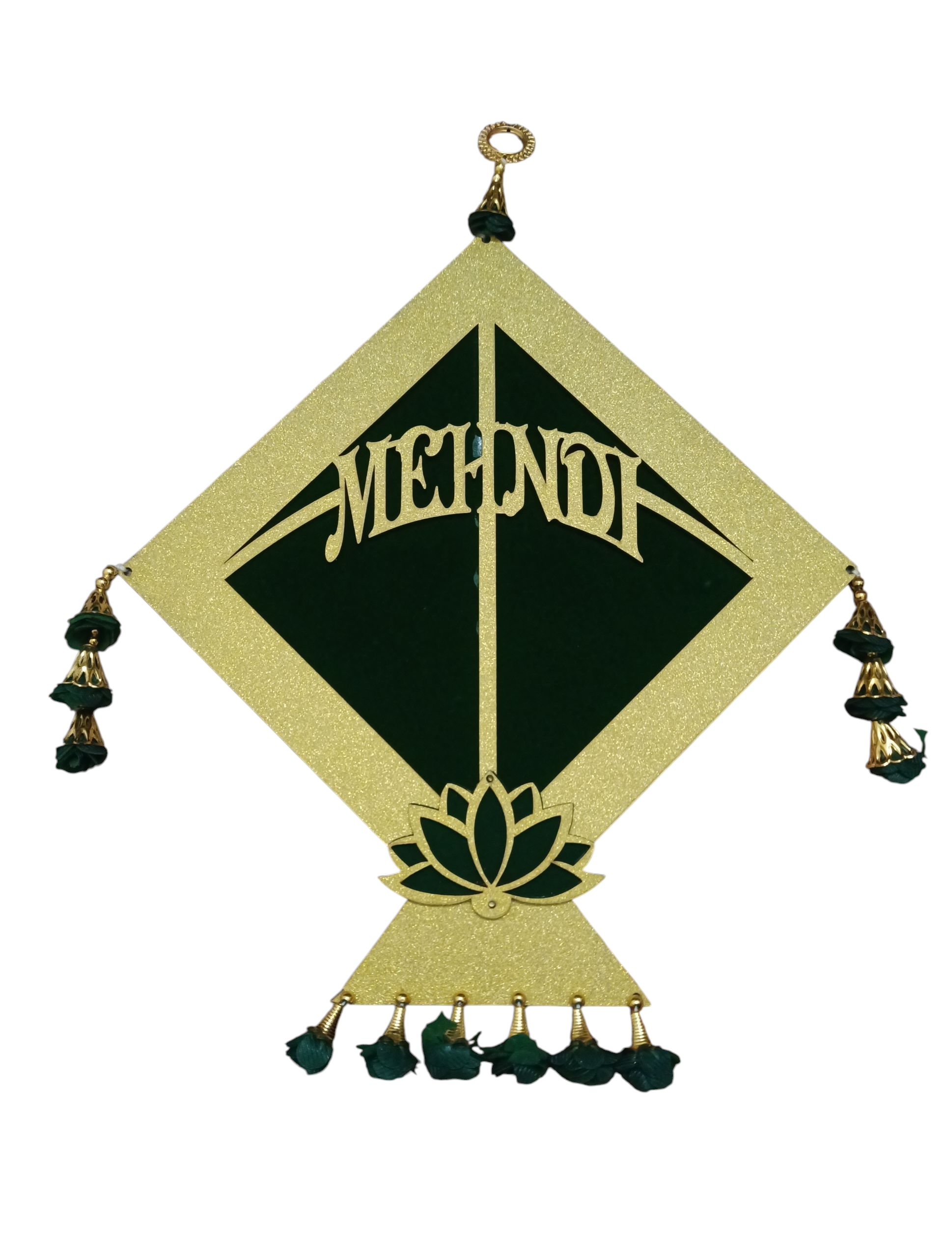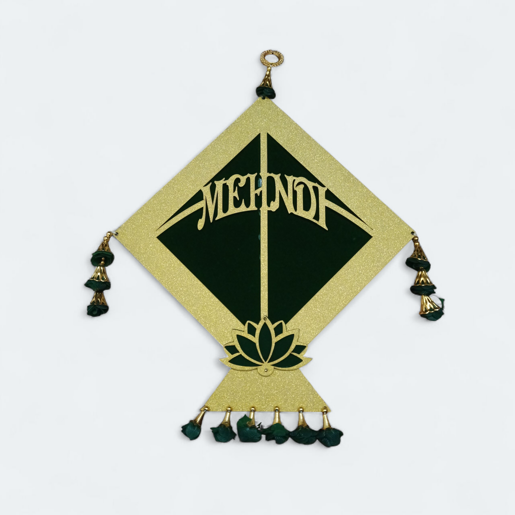 Celebrate your Mehndi ceremony with grace and style using this exquisite Mehndi Decorative Kite Wall Hanging. Crafted in a rich dark green and golden glitter combination, this unique decor piece captures the vibrant spirit of traditional pre-wedding festivities.