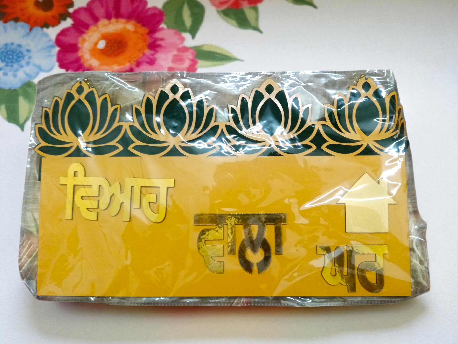Embellished with stunning golden lotus motifs and vibrant Punjabi text, it’s the perfect way to mark the bride or groom's home during pre-wedding rituals like Mehndi, Batna, Jaago, and on the wedding day itself.